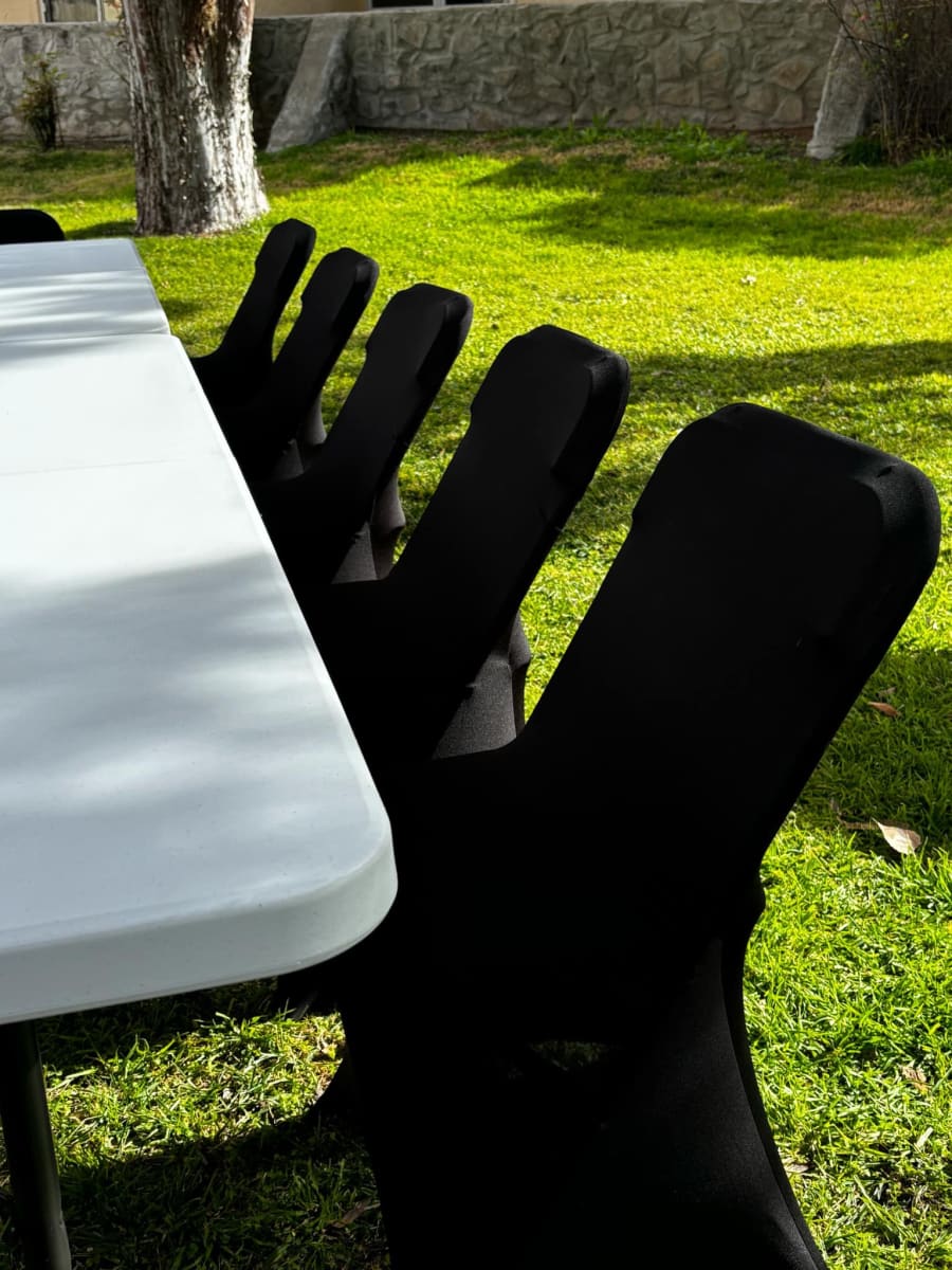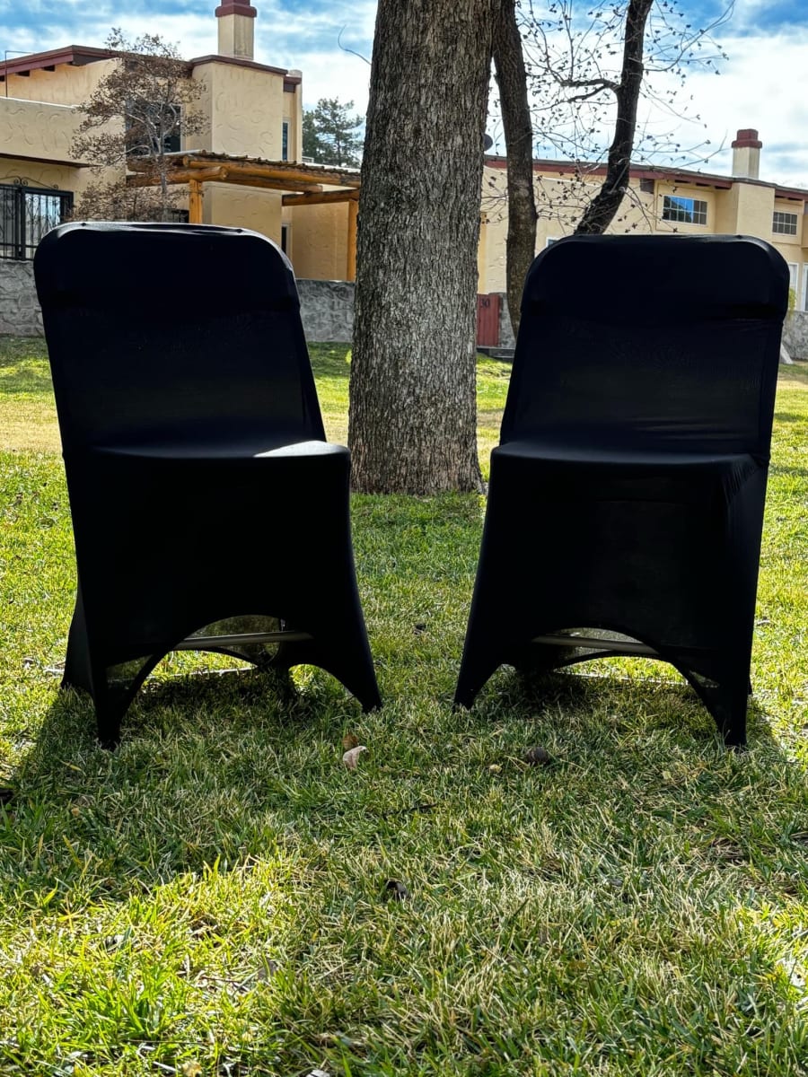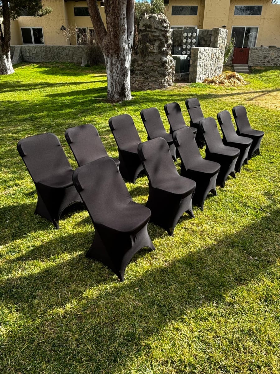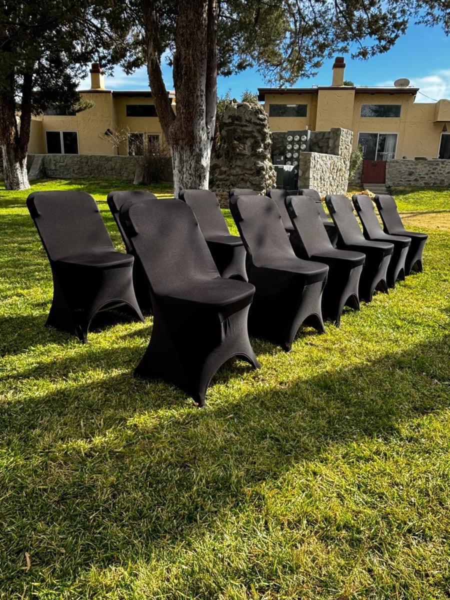 Our Chair Rentals Black Stretch Spandex Chair Covers in Las Cruces service ensures you have access to top-quality chair covers without the hassle of buying. Enjoy the convenience of renting our stylish covers, perfectly tailored for your event needs in the heart of Las Cruces. Our local delivery team ensures that your covers arrive on time, ready to enhance your venue with elegance and charm.